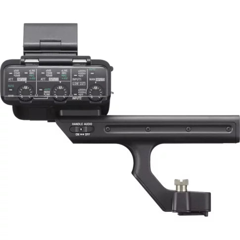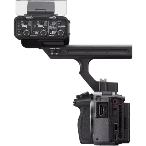 • This version comes with a detachable XLR Handle Unit that offers two XLR/TRS combo inputs for using professional audio equipment. The handle features a microphone mount, physical audio controls, and three 1/4″-20 threads for attaching accessories. It also securely mounts to the FX30 via the Multi Interface Shoe and a pair of screws.