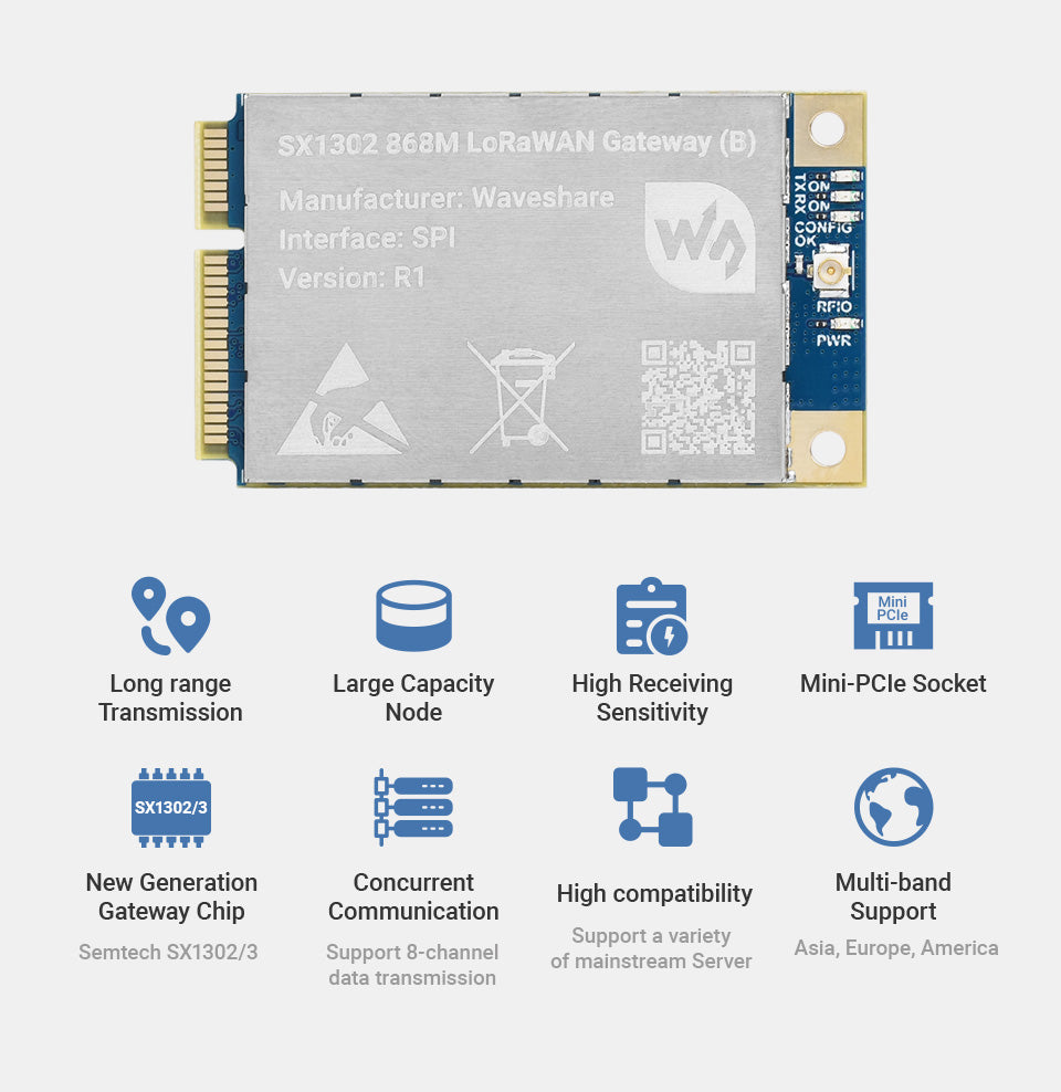SX1302 868M LoRaWAN Gateway HAT for Raspberry Pi, Standard Mini-PCIe Socket, Long range Transmission