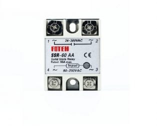 This particular SSR can switch current loads of up to 25A with an 80-250VAC input and a zero cross trigger control method. Each one of these relays is equipped with four screw terminals (for use with ring or fork connectors) and a plastic cover that slides over the top of the relay to protect the terminals.