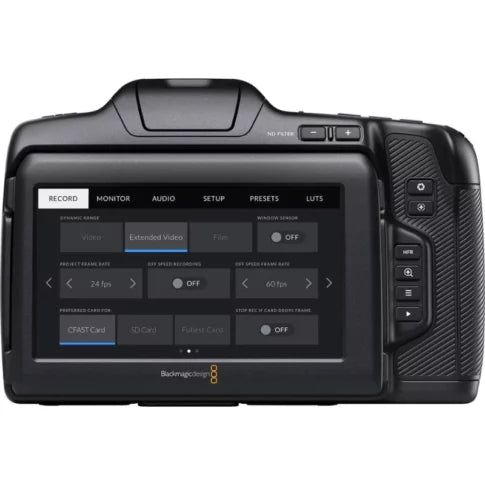 To top their previous achievement with the Pocket Cinema Camera 6K, Blackmagic Design adds an even more full-featured, compact Super35 camera to their cine-style line with the Pocket Cinema Camera 6K Pro. The 6K Pro features all the recording features, sensor, dynamic range, buttons, and ports as its predecessor, and adds a variety of important new features such as a 5″ tilting HDR capacitive touchscreen LCD with 1500 cd/m² brightness, a Pro EVF option, built-in clear/2/4/6-stop ND filters, dual mini-XLR inputs, an accurate timecode clock, an NP-F570 L-series battery slot, and updated Gen 5 color science.