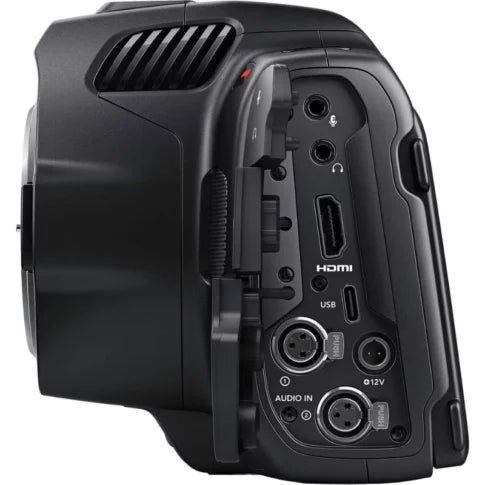 The compact 6K Pro retains the familiar controls and menu layout of the 6K model, such as ISO support up to 25,600, 13 stops of dynamic range, and 1920 x 1080 HDR monitor output. Professional audio support now includes two mini XLR inputs with phantom +48V power, a 3.5mm stereo input, a mono speaker, a headphone output, and a built-in stereo mic system.